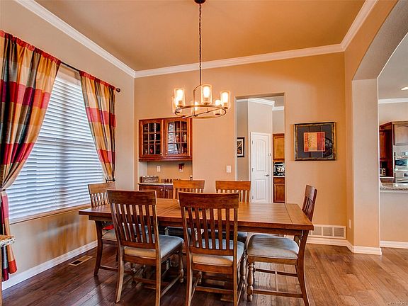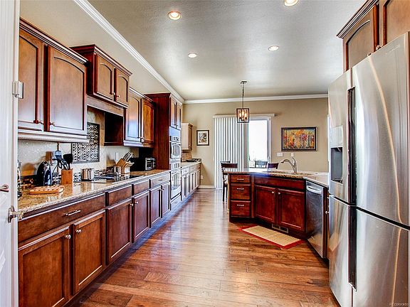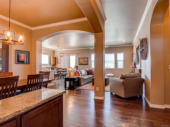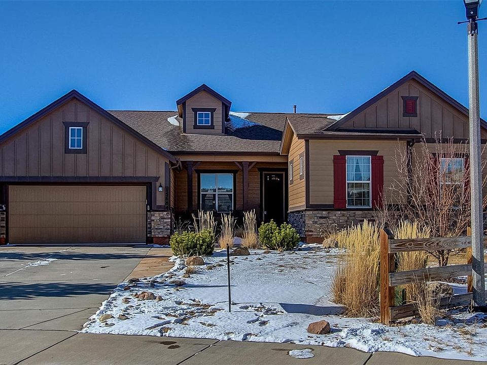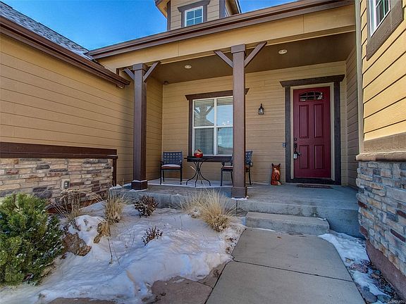 Immaculate rancher in cul-de-sac with unobstructed Pikes Peak, AFA & front range views! Step into the open main level and enjoy the new hardwood floors, upgraded light fixtures & gas fireplace with stone surround & elegant wood mantle. Kitchen has beautiful glass backsplash & feature wall behind cooktop, soft close & pull out drawers, double oven (micro/conv combo), granite slab, pantry and breakfast nook. Master bedroom has bay window ideal for sitting area and adjoining bath with Quartz counters, luxurious soaking tub and walk-in closet. The extra-large 2nd bedroom on main level provides plenty of space for bedroom and playroom. Enormous family room in basement is perfect for entertaining with wet bar with mini fridge, surround sound, large windows. Also on lower level is den with hardwood floors & French doors, junior master bedroom with ensuite bathroom and additional bedroom and bath.