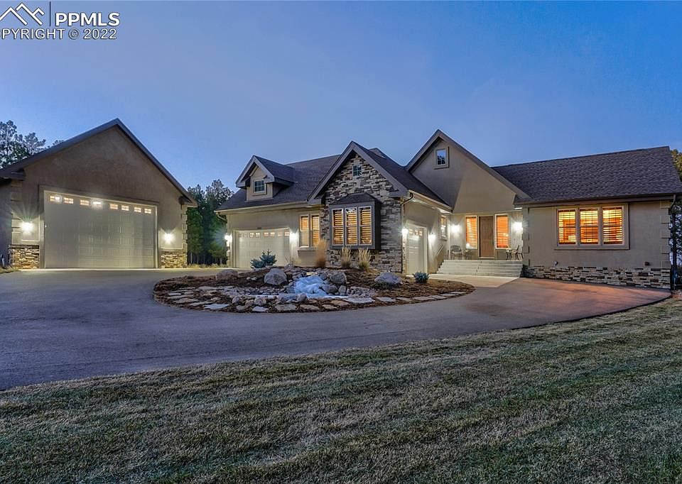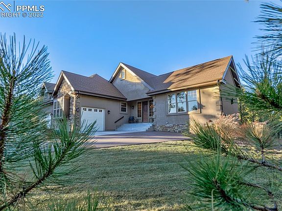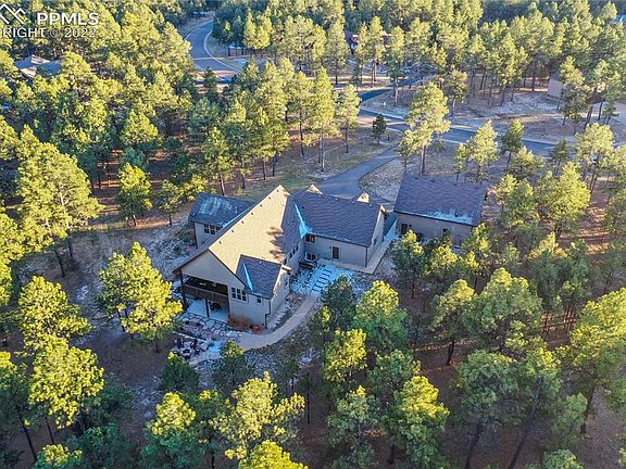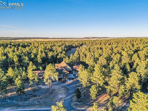 Stunning Custom Built Rancher w/ 3 car attached garage, a 36x28 RV garage, over 2.5 acres w/ gorgeous mature trees backing up to a 136 acre ranch located in the sought after gated Black Forest Reserve. Amazing RV garage that was built in 2021 featuring on demand water heater, stainless steel sink, a 12x16 foot oversized door w/ opener, urinal, epoxy floors, RV waste drain, a 30 AMP RV plug-in, air filtration system, hot/cold water faucets, Hot Dawg thermostat controlled heater, dedicated electric panel and light outlets on the eaves. Central air conditioning, whole house humidifier, high efficiency furnace. Gorgeous high end kitchen w/ a Sub-Zero refrigerator w/ custom metal handles and cabinet paneled to blend perfectly with the Knotty Alder cabinetry, pantry, slab granite counters, tumbled marble back-splash, Bosch dishwasher, double oven and 5 burner gas cook-top. High end finishes throughout including new plantation shutters, hand textured walls, slab granite counters, Hickory stained wood floors, solid Alder doors w/ glass transoms, Alder woodwork. Expansive great room w/ hardwood floors, gas fireplace w/ floor to ceiling stone surround, two walls of windows. Main level primary suite w/ walk-out to back deck, walk-in closet and a 5 piece bath including a large soaking tub, double vanity and over-sized shower. Two main level bedrooms, office, two lower level bedrooms. Fully finished walk-out lower level w/ huge wet bar, media room, family room w/ gas fireplace and game area. High speed StratusIQ gigabit fiber internet. Pre-plumbed gas, electric and concrete pad ready for a generator. The exterior is an outdoor lovers paradise. 22x16 covered composite deck overlooking the mature forest. Lower level patio w/ newer hot tub, gas firepit w/ stone surround. Professionally landscaped w/ sprinklers, drip irrigation, water feature w/ waterfall, flagstone path, asphalt driveway paved in 2021, lush yard area, stone retaining wall, large boulders, tons of beautiful flowers.