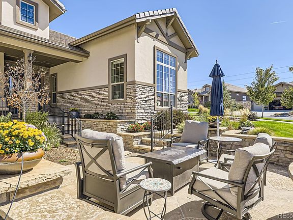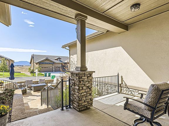 One-of-a-kind Toll Brothers Venable Model with Front Range Mountain views in the coveted Anthem Ranch 55+ community. This 2-bedroom, 2.5-bath home sits on a spacious corner, xeriscaped lot with an upgraded stone front patio. No detail was overlooked, featuring wide plank wood flooring throughout, beamed ceilings, surround sound with speakers, quartz and granite counters, and soaring ceilings and doors. Enjoy seamless indoor-outdoor living with stackable Colorado doors leading to an east-facing covered deck, perfect for cool summer evenings. The home offers built-in closet organizers, upgraded lighting, and abundant storage. A spacious office with double French doors greets you at the entrance, while the gourmet kitchen impresses with white soft-close cabinets, double rollouts, a large island with storage on both sides, and a walk-in pantry. The designer backsplash complements the built-in KitchenAid refrigerator and high-end appliances. Colorado stackable deck doors bring in the outside to this gorgeous home. An additional half-bath near the large laundry room, complete with extra cabinets, designer tile flooring, and a Samsung washer and dryer, adds convenience. The mudroom off the 3-car garage, which boasts epoxy flooring, extra shelving, and a painted finish, provides even more storage. The primary bedroom is a luxurious retreat with a cozy gas fireplace, European frameless shower, quartz counters, Elfa shelving in the walk-in closet, and wide baseboards for an open, spacious feel. The second bedroom features an ensuite 3/4 bath with designer tile and quartz counters. The unfinished basement offers potential for future customization, with a humidifier, radon mitigation system, and window well covers already in place. Don’t miss the 30,000 sq ft Aspen Lodge with indoor/outdoor pools, hot tubs, fitness center, and over 130 clubs, plus 48 miles of scenic trails around the neighborhood. A truly immaculate and well-designed home!