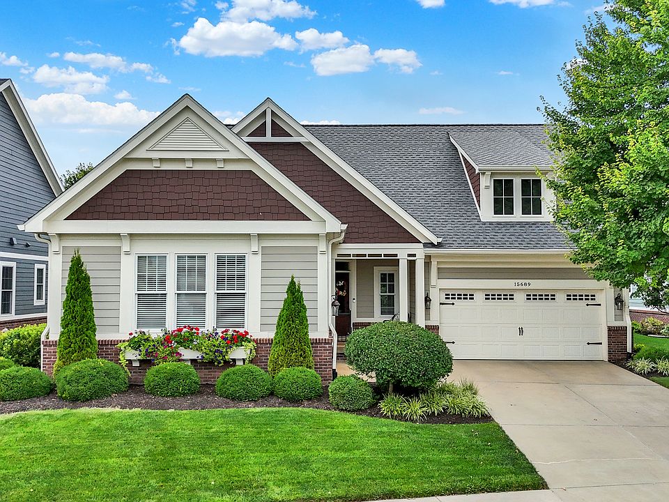 This beautifully maintained home in the gated Bridgewater Parks offers the perfect balance of everyday comfort and luxury living. With access to The Bridgewater Club's clubhouse, golf, pools, dining, events, and fitness amenities, it's more than a home- it's a lifestyle. The inviting floor plan showcases 10' ceilings on the main level and hardwood floors flowing through the kitchen, great room, dining, and breakfast areas. The gourmet kitchen features granite counters, stainless steel appliances, and under-cabinet lighting, ideal for both daily living and entertaining. The spacious primary suite includes a garden tub, dual vanities, a separate shower, and a walk-in closet, while a dedicated office with custom French doors provides the perfect work-from-home retreat. Year-round living awaits in the enclosed porch with a gas fireplace, glass surround, and remote-control blinds. Outside, a paver patio creates the perfect setting for al fresco dining, and extensive landscaping includes a drip system that automatically waters all of the plants for easy maintenance. The lower level is designed for gatherings, featuring a recreation room, bedroom and bath, and a full wet bar. Additional highlights include epoxy garage floors, dual sump pumps with battery backup, a tankless water heater, and a roof replaced in 2020. Just a short walk to the neighborhood park and walking trails, this home is set on a large lot with mature trees and outdoor entertaining spaces-combining luxury, comfort, and community in one of Carmel's most sought-after golf course neighborhoods!
