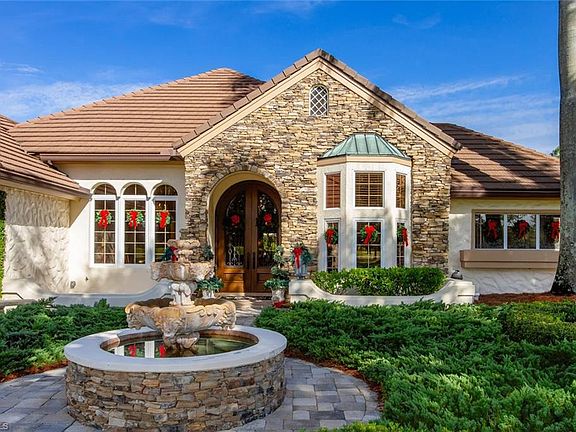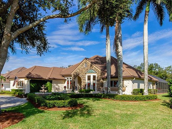 Extraordinary curb appeal abounds with this warm and inviting estate home, located in highly sought after Fiddlesticks Country Club. Beautifully remodeled and offered furnished, this home provides timeless architecture with refinement and luxury throughout. As you arrive, you are greeted by new circular paver driveway, new custom hurricane rated fiberglass garage doors, and a new fountain that leads to new custom double hurricane rated entry doors. Inside features include tall tray ceilings, crown molding, formal living and dining room with new wood flooring, a newly remodeled kitchen with granite countertops and light wood cabinets. Master bedroom opens to lanai, updated master bath has dual sinks, separate tub and shower, master closet offers rotating carousel. One garage converted to air-conditioned home gym. Screened-in paver lanai features heated pool and spa, covered seating area, and unique cabana bar with pool bath. Conveniently located near dining & shopping, including new Whole Foods, Fiddlesticks offers 2 championship golf courses, clubhouse with dining, fitness room, 8 Har-Tru tennis courts, resort style pool w/ cabana bar. Please see our new Matterport 3D Virtual Tour!