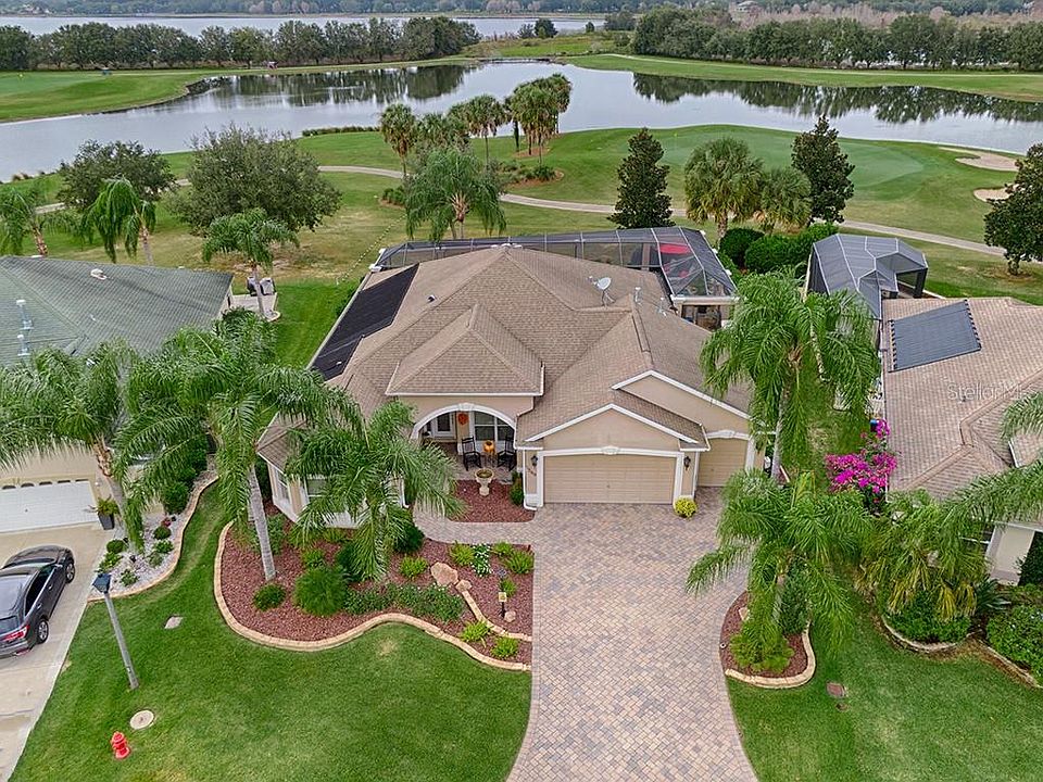 GORGEOUS, 3/2/1 EXPANDED GARDENIA ON FABULOUS WATER AND GOLF VIEW in the Village of Sunset Pointe! Not only does it have a GOLF CART GARAGE & HEATED SALT WATER POOL & SPA w/incredible PILLARED BIRD CAGE & outdoor entertaining space, it sits on the HERON GOLF COURSE w/breathtaking views of both a pond & LAKE MIONA! Enter through the leaded glass entry onto diagonal tile floors that stretch through foyer, kitchen, hallways and wet areas - Crown molding & premier ceilings thruout! Custom cornices adorn windows & stack back sliding glass doors that open from the Living area to the lanai, pool & amazing views of pool, golf & water! The kitchen features CHERRY CABINETRY w/hardware & pull-outs, GRANITE counters w/GLASS MOSAIC BACKSPLASH, PANTRY CLOSET, GAS range w/DOUBLE OVENS, French door refrigerator w/bottom freezer, BOSCH dishwasher, ISLAND & breakfast bar. The master features his & hers closets w/built ins, en-suite bath w/dual sinks, tiled walk-in shower & separate toilet area w/window & privacy pocket door. There's a linen closet & a laundry area tucked behind louver doors! The guest bedrooms are currently used as office/art studios; one features a bay window & lots of craft cabinets. The guest bath w/tile surround tub/shower has a door that opens to the second bedroom. Step out through the stack back sliding doors to your own private paradise & endless views! There's a wet bar & cabinetry, electric fireplace & mounted TV. A pillared birdcage covers a heated salt water pool w/waterfall & spa! HEAVEN!