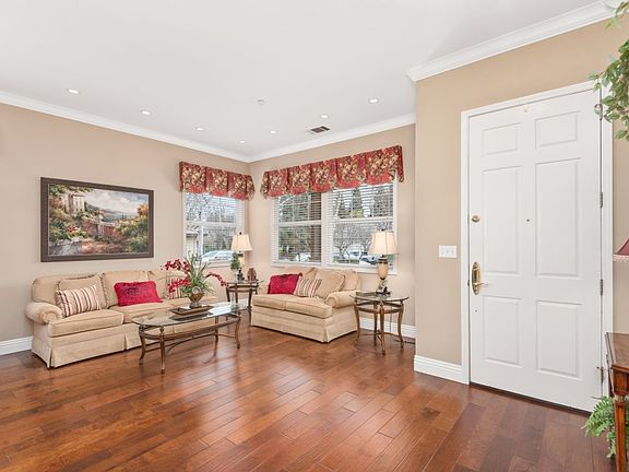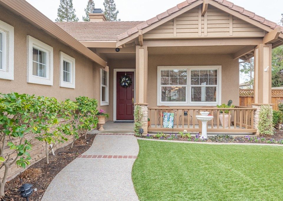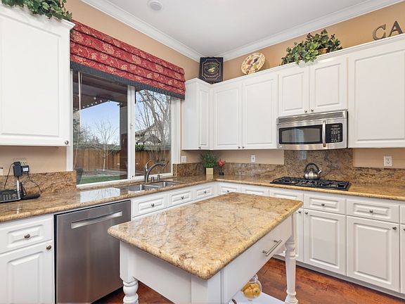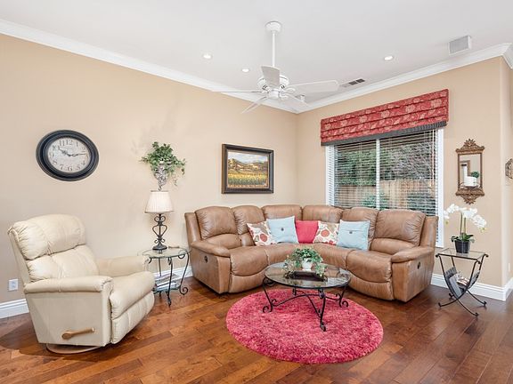 Positioned in a stunning Neighborhood, the location of this home is idyllic. The situation of this home is walking distance to the Lawrence Livermore National Laboratory. You will notice the fantastic curb appeal of the front yard, but you won t notice that the lawn is In fact artificial! Beautiful green lawns all year round, and low maintenance. Enter this lovely home onto hard wood floors through a spacious entry way. The front entrance is complemented with a formal living and dining room complete with crown molding and dimmable canned lighting giving the home a luxurious feel. Cross into the kitchen and living room area to discover an abundance of large windows giving the space luminous lighting. This gourmet kitchen of your dreams includes granite countertops, beautiful cabinetry, all stainless steel appliances including a gas stove, ample counter space, and a portable granite island. The spacious master bedroom is presented with new carpeting and a full length closet equip with fantastic custom closet inserts. Enter the master bath to a stunning display of marble countertops, dual sinks, tile flooring and shower, and a jacuzzi tub. Both additional bedrooms have spacious closets, new carpeting, and crown molding to furnish. Spend time relaxing in this commodious backyard under the pergola cover. You will enjoy the spacious lawn and soothing waterfall sounds coming from dual fountains equip with plumbing. The yard is complete with a large shed, side yard access, and Mandarin, Naval Orange, Peach, and Cherry trees!