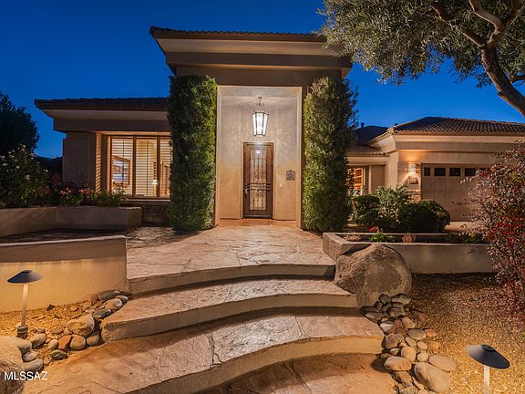 Classic elegance abounds in this entertainer's dream home in Quail Creek. Expanded Cheyenne model w/ 3,451 sq.ft., has 3 BR and 2.5 BA in the main house, and a 2-story 664 sq.ft. Guest Casita/Studio with kitchenette, bath and loft -- the only one of its kind in Quail Creek. Expansive formal space w/ Living and Dining room, Den/sitting area, and custom Office with built-in desk/shelving. Open concept kitchen and family room has granite counters, center island, wet bar, breakfast nook, gas fireplace. A gardener's paradise in the desert on .33 acre lot on a quiet cul-de-sac. Breathtaking views from the backyard and casita loft. Upgraded finishes throughout, wood plantation shutters, custom lighting, extra insulation in walls/ceilings. Solar, Golf cart garage, screen porch. Newer HVAC.
