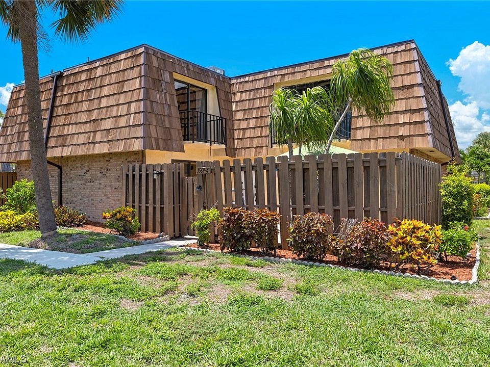 PRICE IMPROVEMENT of $5K! This lovely 2 bedroom, 2 bathroom home is being offered furnished and has a 2023 Roof, 2022 Water Heater, a 2020 A/C System, beautiful NEW white shaker cabinets and rich luxury vinyl plank flooring. The fenced in courtyard has an eastern exposure with lots of natural light during the day and welcoming shade in the afternoon. Each bedroom has a balcony that overlooks the private courtyard. If you are one to enjoy swimming, the community pool is a quick 60 second walk from the front door. This community is situated between Summerlin and US 41 just north of Cypress Lake Dr., a very convenient location! The HOA Fees are $325 per quarter and include lawn and community pool maintenance, an incredibly affordable option as a homestead or as a winter getaway!