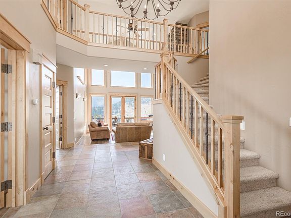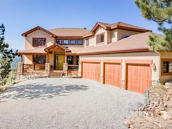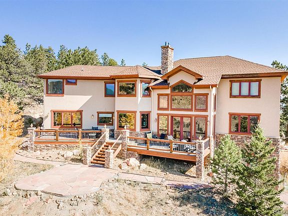VIEWS, VIEWS, VIEWS! This private, picturesque 5 bedroom, 4 bath home epitomizes the Colorado lifestyle and offers expansive 360 degree mountain views from nearly every window. The chef's kitchen includes a bar, eat-in area, granite counters, a prep sink, a double sink with huge views out the window above it, stainless steel appliances, including a 6-burner gas Thermador double oven and hood. The kitchen provides lots of storage, counter space, and a walk-in pantry. Also on the main level is a great room with a cathedral ceiling and double-sided wood-burning stove/fireplace, tons of big windows for the even bigger views, a large office, a guest suite with a full bath, and a spacious mud room that accesses the 4-car garage. Upstairs is the enormous master suite with his and her walk-in closets, a 5-piece master bathroom with steam room, and more spectacular views! There are three more spacious bedrooms on the upper level and another full bath. The lower level is a partially finished walk-out with a roughed-in bathroom and bar area. The front of the house has a spacious covered porch, and a large deck along the back of the house and fieldstone patio all offer phenomenal views and great entertaining areas. Only 10 minutes from I-70 and an hour from Denver and major ski resorts!