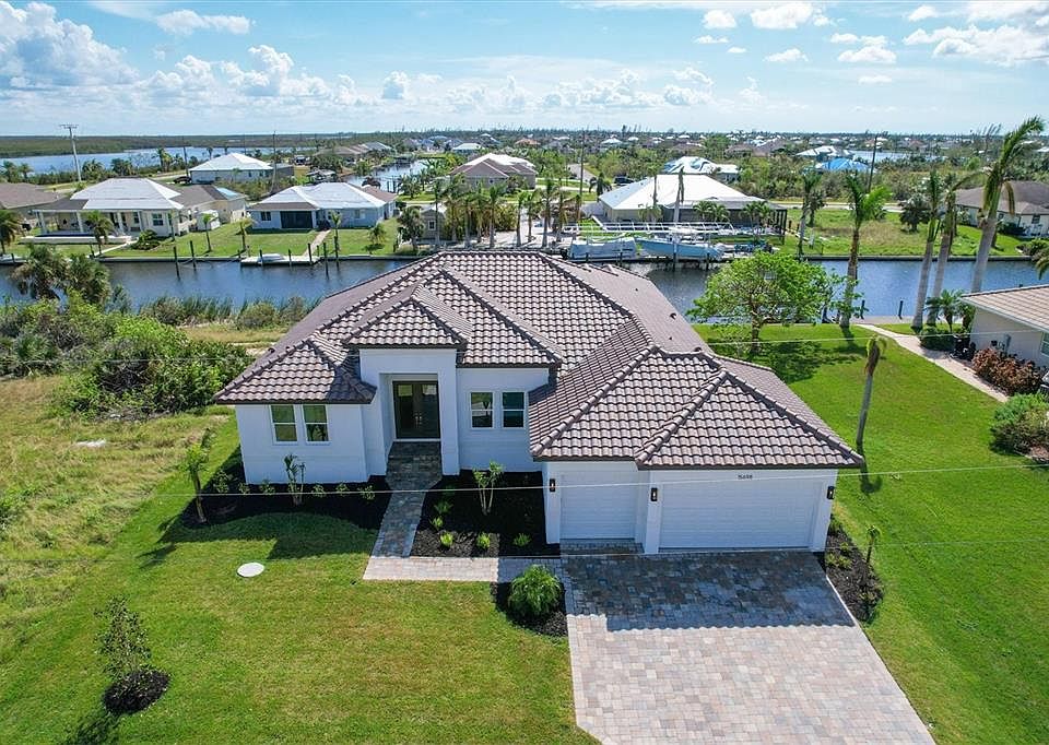 Sensational, new luxury Gulf access home in a prime canal front location in South Gulf Cove. The move-in ready property offers large vessel, no bridges and fast exit to Charlotte Harbor. Enjoy all the benefits and rigorous quality of new construction from a premier local builder without the 2+ year wait. A superb open layout, the home has an expansive great room, tall coffer ceiling, chef's kitchen with a gas burner range, pot filler faucet, large island, immense covered lanai, and outdoor kitchen. Premium features include impact rated Low-E windows and doors, plank tile flooring throughout the entire home, designer quartz stone counter tops, shaker cabinets, and jumbo 3 car garage that's 24' deep and epoxy flooring. The water frontage has 80' of concrete seawall and beautiful views up and down the canal. Just minutes to historic Boca Grande, miles of pristine beaches, Gasparilla Marina, or take pleasure boat cruises to Punta Gorda, Burnt Store Marina, Bokeelia, Cabbage Key, Captiva Island, and many more destinations.
