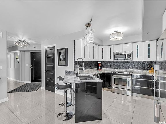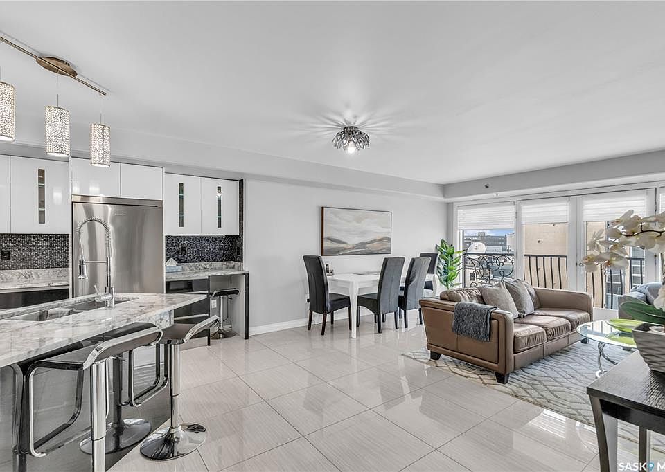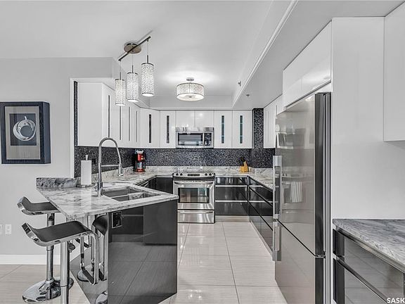 This fully-furnished executive top-floor suite with has everything you need, including two underground parking spots. Historic elegance meets modern luxury at the Residences at King George. Originally built in 1912 and thoughtfully redeveloped in 2010, this iconic landmark is close to shops, dining and just a few blocks from the scenic riverfront. Luxurious limestone tile flows throughout, and floor to ceiling windows provide tons of natural light. The kitchen features sleek granite countertops and high-gloss white cabinetry with glass shelving and built-in accent lighting. A full stainless steel appliance package adds to the kitchen’s functionality and style. Two sizeable bedrooms provide plenty of room for rest and relaxation, with ample closet space. The primary bedroom includes a private ensuite bathroom, ensuring a touch of luxury and privacy. The second bedroom is equally spacious, with easy access to the main bathroom, making it perfect for guests or a home office. Enjoy the convenience of in-suite laundry, and two secure underground parking spaces, providing peace of mind and protection for your vehicle year-round. For those who love to entertain or simply relax outdoors, you'll have access to a stunning rooftop deck. Complete with fully equipped outdoor kitchen, this expansive space is perfect for hosting friends or unwinding while taking in panoramic views of Saskatoon. Don't miss this chance to experience the best of historic charm and contemporary luxury at the Residences at King George. Your downtown oasis awaits!