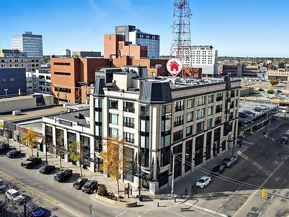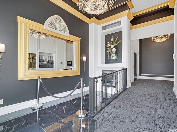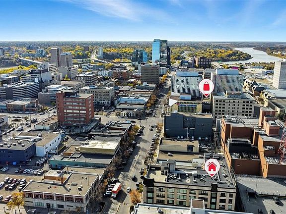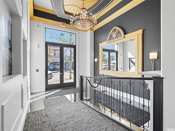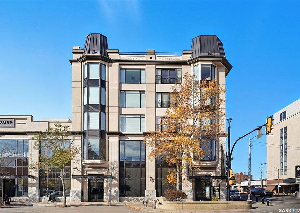 A Rare Opportunity to Own a Piece of Saskatoon’s History! Welcome to The Residences at the King George — an iconic landmark originally built in 1911 and fully restored by Meridian Development in 2010. Reconstructed from its original concrete frame with all modern materials and mechanical systems, this award-winning building showcases a transitional French design that blends heritage and modern luxury. Historic details such as the original chandeliers, lobby monogrammed keystone, and ornate black powder-coated stair railings have been beautifully preserved. This stunning top floor corner unit offers a perfect mix of elegance, comfort, and security in the heart of downtown Saskatoon — steps from restaurants, shops, services, and nightlife. The high-security building features video surveillance and coded/fob access at all entry points. Inside, enjoy newer engineered hardwood flooring, floor-to-ceiling windows, and an East-facing balcony with city views. The designer kitchen includes granite countertops, ceiling-height cabinetry, large island with seating, dual undermount sinks, wine fridge, under-cabinet lighting, garburator, and premium appliances — including a GE Café induction range and Bosch dishwasher. Additional upgrades include modern lighting and hardware, Hunter Douglas blinds, Lutron Caseta smart lighting and smart thermostat.The luxurious bathrooms feature black granite tile flooring and oversized vanities. The spacious primary bedroom offers vaulted ceilings, a skylight, and custom built-in closets. Other highlights include in-suite laundry, central air, two heated underground parking stalls, and an 11’ x 7’ storage unit with street-style bike racks. Residents enjoy access to a beautiful rooftop patio with elevator service to the fifth floor and parkade — perfect for entertaining. All of this, just four blocks from the river!