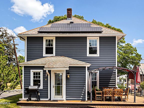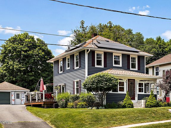 Classic and Classy 3BR Colonial with an impressive list of improvements. (Ask for list.) Open plan with plenty of space for family and entertaining. Wonderful flow onto wrap around porch. Updated kitchen with custom cabinets and granite counters. Half bath and laundry off kitchen. Spacious enclosed porch also makes a great home office. 3 cheery bedrooms with bamboo floors and full bath on second floor. Full basement offers great storage and expansion potential. Large yard with abundant perennials, fruit trees, vegetable garden, and several berries. 1+ car garage with attached workshop. Above ground, heated saltwater pool. Solar panels owned by seller, transfer with the sale. Home Warranty included! Come see to make your Home Sweet Home!