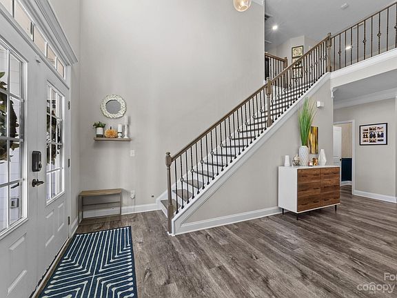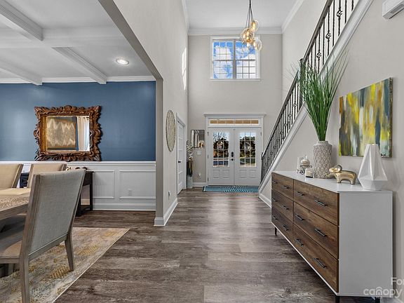 Welcome to this upgraded home that combines elegance w/ modern convenience.Walk in through the lovely front porch w/double door entry to be greeted by a 2 story foyer.You'll find an office w/ french doors, formal dining room w/coffered ceiling, large kitchen w/open floor plan, cathedral ceiling family room w/gas fireplace, main floor laundry, locker storage, guest 1/2 bath, an oversized primary suite w/ a spa-like bathroom & huge walk-in closet. Upstairs, you'll find a versatile loft area, 3 bedrooms (one w/ a Jack & Jill bathroom) & one w/it's own ensuite.You'll love the tasteful wallpaper that adorns the 1/2 bath as well as upgraded lighting fixtures & exquisite woodwork design throughout the house.Even the garage floor has been enhanced with epoxy coating.This charming residence also boasts an Electric Vehicle charger, an expansive covered patio overlooking a flat backyard (already w/ electrical run to add a pool some day) & a handy storage shed.All this & in lovely Mooresville too!
