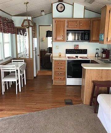 Park Model home with screened porch in the gated waterfront community of Badin Shores Resort. This home has 1 master bedroom on one end with a second bedroom area with divider on other end, an open kitchen, den, and dining area in the center. This property has a storage building and a large parking area for your cars, boats, and golf carts. The resort has pool, beach area, restaurant, club house, playground, boat ramp, putt putt, basketball courts, and all paved roads.