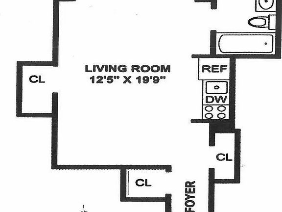 The thoughtfully designed layout includes a comfortable living area, an efficient Pullman-style kitchenette, a windowed bathroom, and three generous closets for ample storage. High ceilings and hardwood floors throughout enhance the home's classic appeal.