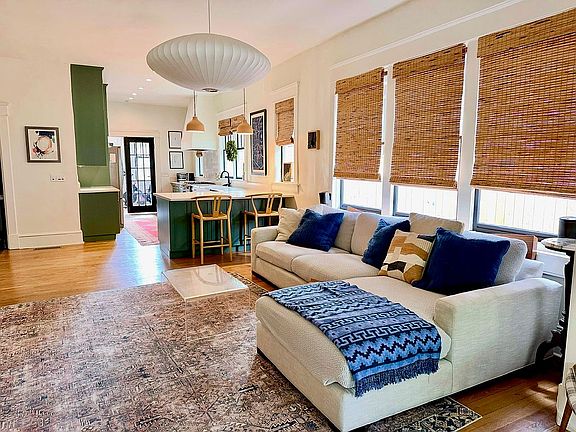 Inside, you'll find 10-foot ceilings, warm hardwood floors, recessed lighting, and classic crown molding throughout. The front living room features a brick fireplace, while the front bedroom, framed by French doors and built-in bookshelves, functions perfectly as a guest room, office, or den. The kitchen was remodeled in 2021 and has Quartz countertops, stainless steel appliances, a custom range hood, stylish backsplash tile, plus a cozy coffee nook and integrated laundry space for added functionality. The primary suite is tucked at the rear of the home and offers a peaceful retreat with a walk-in closet and en-suite bathroom overlooking the backyard. Down the hall, the second bedroom features a large closet and easy access to the second full bath.