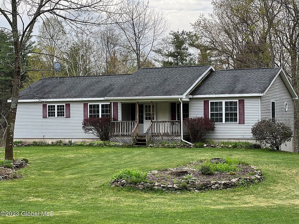 Spacious 1656 sq. ft, 3 bedroom, 2 bath home on 8.47 acres. Built in 2004, this modular home offers a very open floor plan. Large kitchen with lots of counter space and storage. Eating area, plus an eat at counter. Huge Living Room. Master Bedroom with walk in closet and private bath with jet tub, as well as separate shower. 2 other bedrooms are on the opposite end of the house from the MB. Full basement, with a walkout in the back, as well as windows lends itself to adding to the finished sq. ft, down the road. Covered front porch.