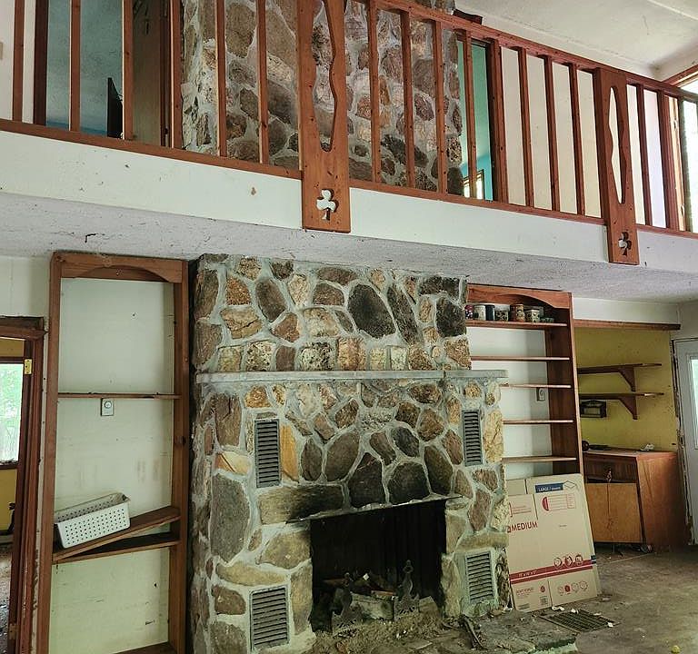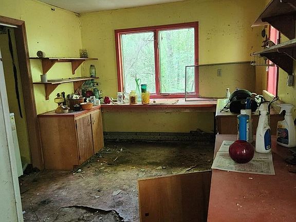 This is a fixer upper with much potential, 3 bedroom, 2 bath on almost one acre, private road, needs a well as it is shared well in the past. Roof is leaking around the chimney but it appears it has caused no damage to the hardwood floors.