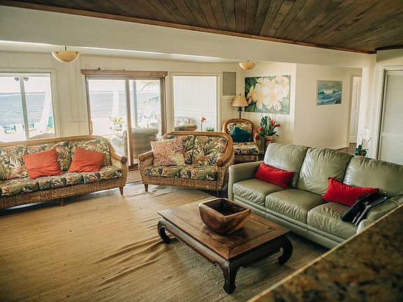 Experience the Hawaiian lifestyle and feel at home in this luxurious 4-bedroom house, a beachfront property that promises an unforgettable escape. This serene home is designed for comfort and relaxation, featuring spacious living areas with a large flat-screen TV and a fully equipped gourmet kitchen with modern appliances, pots, pans, utensils, a refrigerator, dishwasher, oven, microwave, and coffee maker. Enjoy high-quality linens and pillows for a restful sleep, and take advantage of the in-unit washer and dryer with detergent and fabric softener provided. Three well-appointed bathrooms are stocked with essentials, including towels, soap, shampoo, and conditioner. Stay connected with high-speed Wi-Fi and smart TVs with various streaming options. Baby items are available upon request and may carry a small service fee as these items are transferred from another location. Please request them at least 48 hours before arrival to ensure availability. Depending on the pet policy and the breed, pets may be considered for a fee of $50 per pet. This home offers the ultimate luxury of direct beach access from your own backyard. Conveniently located near public transport, with a bus stop just a 5-minute walk away. Taxis are readily available in the area. The property offers easy access for vehicles, and car rentals are available within a 5-minute drive. Driving to Honolulu takes approximately 40 minutes. Local attractions include Laie Point State Wayside (4.4 km), Kualoa Regional Park (16.2 km), James Campbell National Wildlife Refuge (8.7 km), and Polynesian Cultural Center (3.8 km). Quiet hours are from 10 PM to 9 AM. No parties, events, or unregistered guests are allowed. There is a $300 cleaning fee for smoking or vaping inside or on balconies. Extra or unregistered guests will incur a fee of $50 per person per day. Unauthorized pets will incur a fee of $100. Adherence to local laws and regulations is mandatory, including the prohibition of illegal substances on the property. As the home is located in a residential neighborhood, we appreciate your cooperation in respecting our neighbors and maintaining a peaceful, family-friendly atmosphere during your stay.