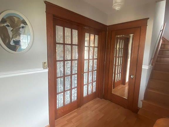 This 2-story Bungalow on Corning's Northside is a must-see! Spacious covered front porch, Foyer, & French Doors. The open FF w/beautiful original HDWD features. Kit has plenty of counter space, w/an addl pantry & workspace. Laundry area on FF along w/a half bath. Beautiful HDWD stairs to the 2nd story to find 4BR w/HDWD flrs. Upstrs full bath has been updtd, & the hallway has a charming built-in closet. From one of the 2nd-flr BR, walk up to the FIN 3rd-story where the possibilities are endless, & w/half bath! LL rec rm, 2car gar, newly stained deck. HSA Home Warranty Included.