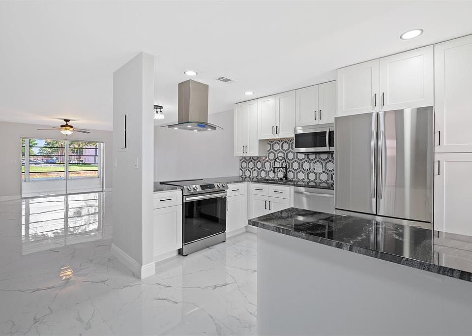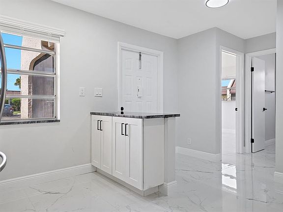 Fully renovated corner villa on desirable Lake Rebecca. This stunning 2 bed, 2 bath villa is located in an active 55+ guard gated community. Recently fully renovated, this unit boast brand new kitchen cabinets, stainless steel appliances, granite counter tops giving the kitchen a fresh and modern feel. Both bathrooms have been tastefully renovated. Beautiful marble look porcelain tile throughout the whole unit. Enclosed patio with full size washer and dryer. Courtesy bus 2 days a week to grocery, shops and malls etc. Lots of amenities included in monthly fee: High speed internet, Comcast Xfinity cable, water, building insurance, 24h guard gate, pool, tennis, café, billiard and so much more.