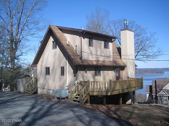 OUTSTANDING 4 MILE LONG PANARAMIC VIEWS OF LAKE WALLENPAUPACK FROM JUST ABOUT EVERY ROOM IN THE HOUSE. This 3 Bedroom, 3 Bath Mountain Chalet includes your own Boat Slip on Lake Wallenpaupack. The main floor features an Open Floor Plan with a free standing propane Fireplace. Kitchen countertops have been upgraded with granite as well as the windows have been replaced overlooking the lake in the living room. The Master Suite has it's own Balcony & Master Bathroom. The family room on the lower level has a wood Burning Stove, Laundry Room, Bedroom, full bath & a full bar. The expanded deck offers stunning views & plenty of room for outdoor entertaining. Don't Miss This One!!!