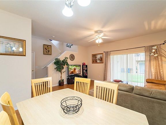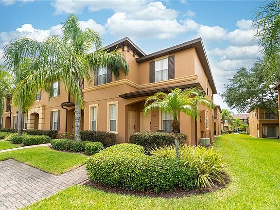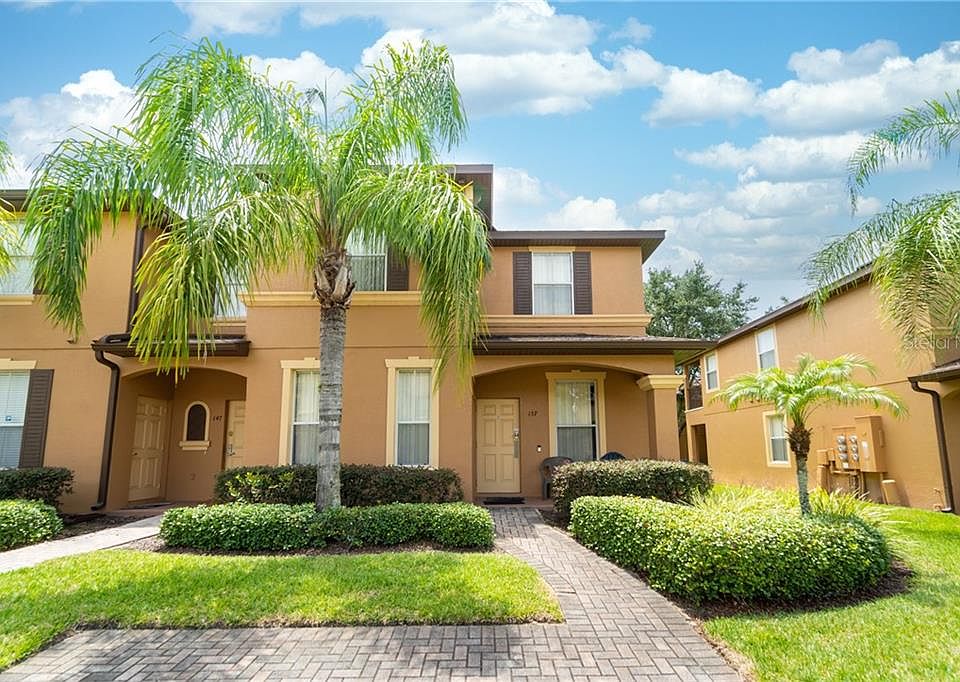 LOCATION LOCATION LOCATION This Charming End Townhome perfectly situated next to the clubhouse in Gated Regal Palms Resort, its the perfect space for a family with 4 bedrooms 3 baths or for short term rental, with Expedia located on premises for you or your renters to get discounted tickets to all major attractions, parks, events. It offers some unique opportunities for you or your rental guest to enjoy, like the restaurant, spa, lazy river pool, regular pool, arcade area, tropical landscape to take a nice walk, playground or have an ice cream in the ice cream parlor so mant amenities for you or your rental guest can enjoy the constant activities, movies by the pool, volleyball, music events, games & much more. This community is so well known for its convenience to travel to Disney parks, Universal Parks, Sea World, Tampa beaches and much more. The kitchen is bright and ample space in the cabinetry to suit all needs, an area for a quick bite, a comfortable family/dining room that allows you or your guest renter to enjoy each-others company, This Townhome has a master bedroom on the main floor with a bathroom and upstair . The dinig room and living room combo ideal for family living leads onto a terrace to relax after a long day. On the 2nd floor are 3 additional bedrooms, a very ample M/Bedroom w/its own bathroom & walk in closet along with a lovley balcony for early mormig coffee. 2 . This home is being sold As-Is and fully furnished it this is a turn key home for 1st time home buyer, or AirBnB type investor. Many uprades as in laminate flooring and tile flooring flooring, water heater lighting and fans new AC UNIT Cable/Internet/roof care and exterior maintenceare included with HOA fees.