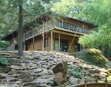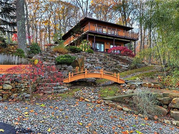 A RARE GEM!!! Enjoy a gracious style of living in this custom built Contemporary Hi-Ranch Japanese-inspired 3 bedroom, 2 bath home. This 2,270 sq. ft. home is designed with Feng shui principles which focus on the art of arranging the building and spaces with an energy flow inside and out to achieve harmony and balance. Located in the Pinewood Lake community, this 1.75 acre property is nestled on a steep hill overlooking the lake. The experience begins outside with Japanese gardens surrounding the home with terraces, walkways, stone walls, and water features, including a bridge/pond and special plantings. Inside Shoji screens throughout create soothing lighting and an elegant separation of rooms. Abundant natural light everywhere with sliders to multi decks on both floors. Skylights, vaulted knotty pine ceilings and parquet wood floors throughout offer a feeling of nature and open space. Wood-burning stone fireplaces on both levels; sauna on lower level. Updates include: new gas furnace and stove, hot water heater, central A/C, complete renovation of master bath and more! This house offers deeded rights to Pinewood Lake, a short walk from the property. Optional membership offers access to a beach with clubhouse, canteen, swimming, boating, fishing, ice skating and more. Close proximity to award winning schools, town pool, hiking/bike trails and shopping. Located in historic Nichols section of Trumbull with major highways just minutes away. Don't miss this one of a kind home!