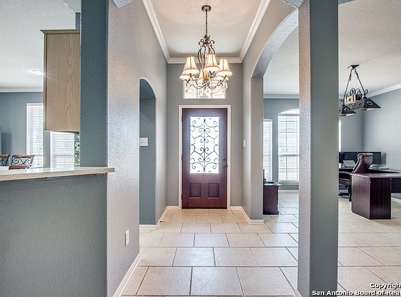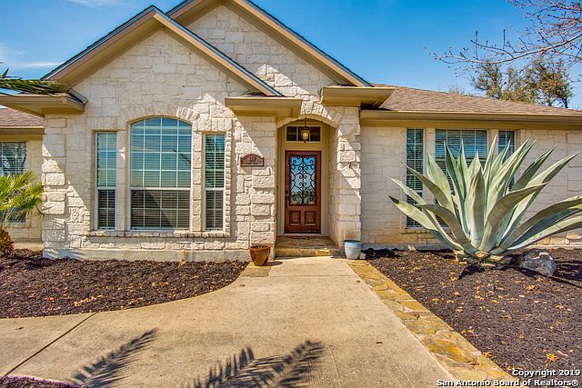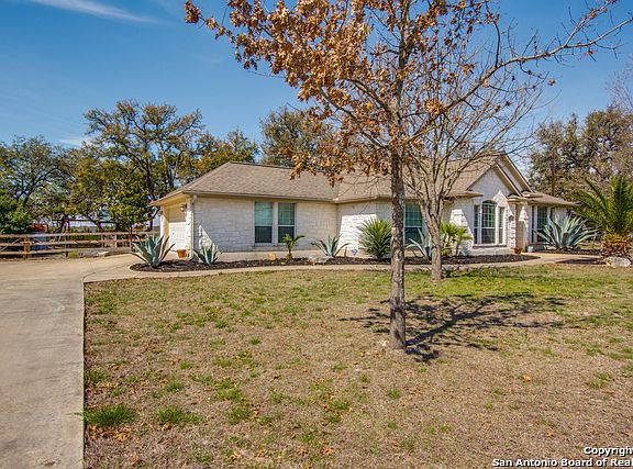 Beautiful hill country sunsets from your massive back porch in this 3/2 home on .5 acre. BBQ, fish or take a dip at the swimming hole on the Medina River just minutes from your home. Brand new quartz countertops throughout and gorgeous glass tile backsplash in kitchen. Great open floor plan perfect for entertaining all on one level with a split master bedroom separate from guest bedrooms. Lots of privacy, huge mature oak trees, and a large park across the street. Shed and playground convey.
