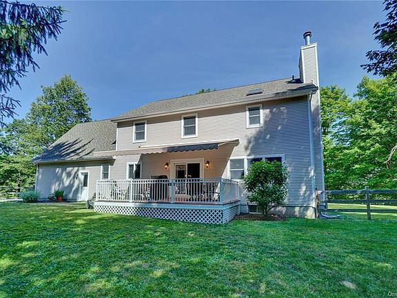 Private and grand paved driveway to hill top getaway nestled in a private wooded property. Pristine one owner custom build home with top of the line everything! Surrounded by woods and mature landscaping, escape into this park like setting on 6.2 acres. Appreciate front porch views of the Hudson Valley. Gleaming hardwood floors throughout the lower level, and carpet like new on the second level. The family room boasts Vermont cast iron dual wood burning stove with wood mantle and Hunter Douglas Wood Blinds. The kitchen is spacious with center island, oak cabinets, high end stainless steel appliances, and double oven. The room is flooded with light through the glass sliding doors that lead to the back deck. A butler service area is ready to help you entertain in your spacious formal dining room with chandelier. The bedrooms are located upstairs and all good side with ample closet space. The master bedroom has a walk-in closet. The spa inspired master bath has duel sinks, jet powered tub, and glass shower with ceramic tile. The maintenance-free composite deck overlooks a very private, fenced in back yard and has a retractable motorized awning for shade. Work from home or just relax in your fully finished and carpeted media/bonus room. Appreciate the underground sprinkler system keeping the lawn green and landscape vibrant all-season long. The home and property are protected by fire and security alarm with central monitoring. This home is super neat and clean and recently painted. The mechanicals are serviced regularly. Look no further, it's all here for you including central air conditioning in this turnkey home.