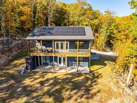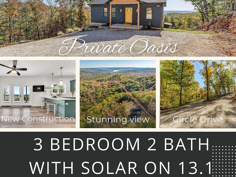 Discover peaceful Ozark living with picturesque views in this rare find on 13.1 scenic acres near Table Rock Lake. The creative opportunities for using the land and enjoying all your outdoor toys are endless. With one-level living designed for efficiency, scenic wooded views, and affordable utilities, this home perfectly blends practicality and natural beauty. The kitchen features black fingerprint-resistant appliances including refrigerator, stove, dishwasher, and microwave. Step onto the expansive deck or walkout on to the large hot tub-ready patio to take in the forested landscape and distant lake view.This all-electric home includes solar panels with battery backup, a private well, and septic system so utility bills are very low. The main bath offers cozy heated tile floors, and laundry is conveniently steps away from the bathroom on the main level. A shed on the patio provides for extra storage space. With over 13 acres for outdoor recreation, gardening, or expansion, this Table Rock Lake area property blends self-reliance, comfort, and the tranquility of the Ozarks. Agent is the owner.