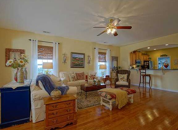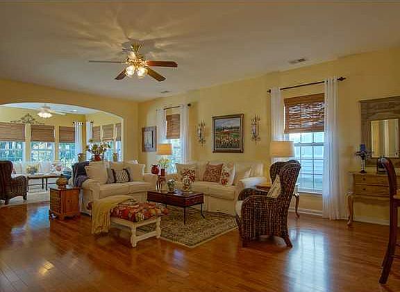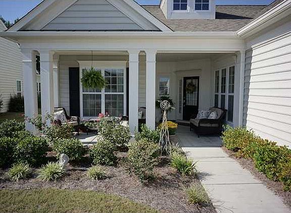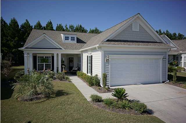 This freshly painted Surrey Crest is an elegant two bedroom ranch with two full baths. Immaculately kept shows like a model home. The open floor plan has an expansive 17x23 great room and a study with a sunroom. Upgrades included in kitchen are GE stainless steel appliances and Whirlpool Gold refrigerator, center island, granite countertops with 42" maple cabinetry, custom tiled backsplash and designer pulls. Gleaming hardwoods in great room, study and foyer and 18x18 ceramic tile in kitchen, bathrooms and laundry room. Ceiling fans in all bedrooms plus great room. Outdoors you will find an entertaining patio with gas line for grilling overlooking a serene wooded backyard. Extensive landscaping was recently installed too. Save thousands by buying a resale! Del Webb Charleston's amenities at The Resort include a Recreation and Social Center. Complete with a state-of-the art workout facility, aerobics studio, heated indoor pool and hot tub, men's and women's locker rooms, a social lounge and multi-purpose space to accommodate the varied interest groups. In addition to the indoor amenities, homeowners will enjoy miles of walking trails, tennis courts, pickle ball courts, bocce courts, a heated outdoor pool and hot tub, a sun deck and the beauty of preserved wetlands and peaceful open space.