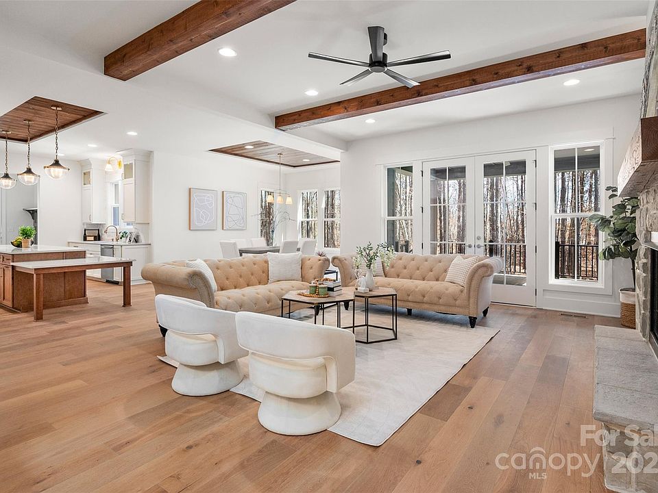 Step inside and you’ll immediately notice the wide-plank hardwood floors and detailed trim work. The main level offers a private office with custom built-in shelving, while the open living area is enhanced by exposed wood beams and striking ceiling details. The chef’s kitchen showcases custom cabinetry, a built-in panel-faced refrigerator, a 36-inch gas cooktop with a custom hood, and a massive multi-level island perfect for both seating and cooking. A spacious walk-in pantry with built-in shelving completes this dream kitchen.