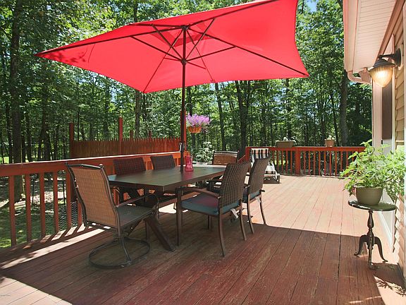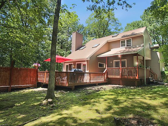 Wonderful Contemporary on 1.7 Acres in desirable Pocono Mountain Woodland Lakes! This 3 bed, 2 bath home sits on a flat, wooded, corner lot on a quiet street with over 1,000SF of wraparound deck space. Inside you'll find 1,800 finished SF featuring a sunken living area with soaring vaulted ceilings, stone fireplace with brand new top-of-the-line pellet stove, 1st floor master suite, 1st floor laundry, hardwood floors, stainless appliances, ceiling fans, multiple French-Door entryways to the outside, and two spacious guest rooms upstairs. Ample closet space, a recently re-done encapsulated high-crawlspace, one car garage, and two utility sheds ensures plenty of storage! Enjoy summer evenings around the paver stone fire pit and patio, or explore the many nearby amenities PMWL has to offer!