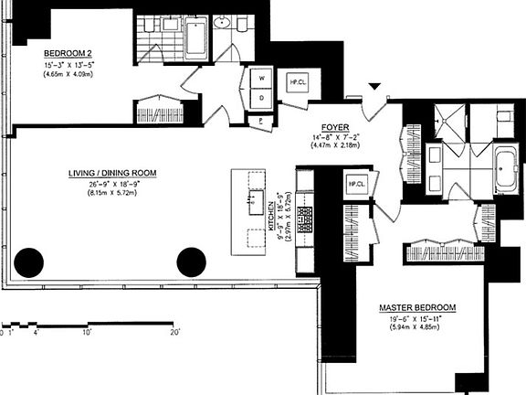 Perched 40 floors above Manhattan, this spacious corner residence spans 1,985 square feet, offering 2 bedrooms and 2.5 baths. The residence boasts south and west exposures, providing breathtaking views of the city skyline. Enter through a gracious foyer that leads to an expansive Great Room, nearly 27 by 19 feet, featuring an open Chef's kitchen. The kitchen is a culinary dream, equipped with a large island with built-in seating, diamond fall granite countertops, professional appliances, and handcrafted custom cabinetry by Smallbone of Devizes.