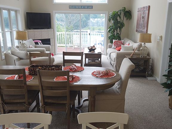 Located lake front in the Deer Hill Village section of Deerfield Resort. Cart path in front of home to the swimming pool and boat dock. Entry level has great room with fireplace, kitchen, dining, master suite, 1/2 bath, laundry room and walk out deck. Upper level is all master suite. Lower level has 2 bedrooms, bath, family room, sitting area and walk out deck. Sub basement has one bedroom, bath, large finished storage and walk out deck. Lots of glass windows and glass doors.