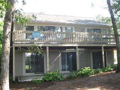 Claude Miquelle contemporary overlooking the 6th green of the Dunes Golf Course offering an open floor plan featuring cathedral ceilings in the living room with brick fireplace and sliders leading to a large wraparound deck. Kitchen has upgraded appliances, including Sub-Zero refrigerator, both bathrooms have been completely renovated and the exterior and deck were recently stained. Two car garage with a stone circular driveway with lovely stone walls and perennial gardens and plantings.