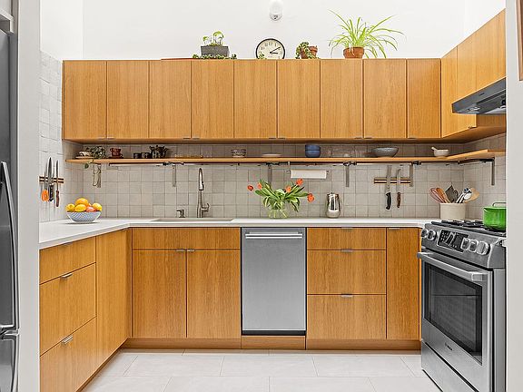The bright and open, renovated kitchen is a dream. Flooded with natural light all day, it has wraparound Caesarstone counters, Moroccan tile and custom oak cabinetry. The stainless-steel appliances include a Fisher&Paykel refrigerator, Bosch stove and silent dishwasher.