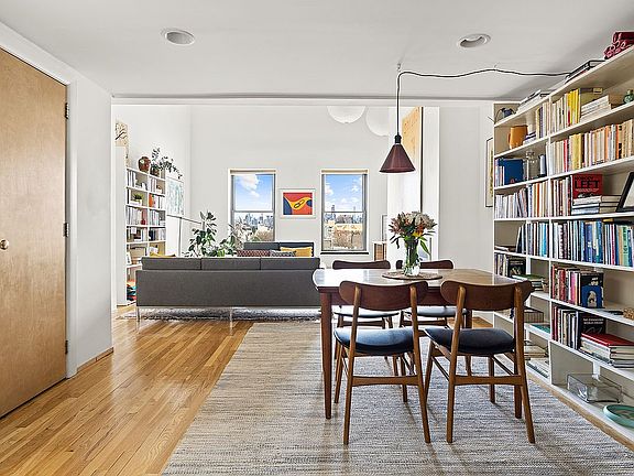 A welcoming bamboo-lined foyer (with the first of 5 spacious closets) invites you into the space, where you’ll be bowled over by the expansive open dining and living areas with a wood burning fireplace, phenomenal views of the Empire State building and Manhattan skyline, and deep window seats where you can spend hours looking out over the neighborhood.