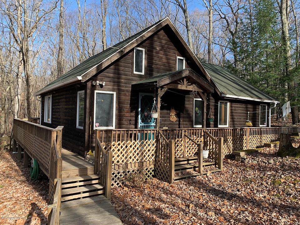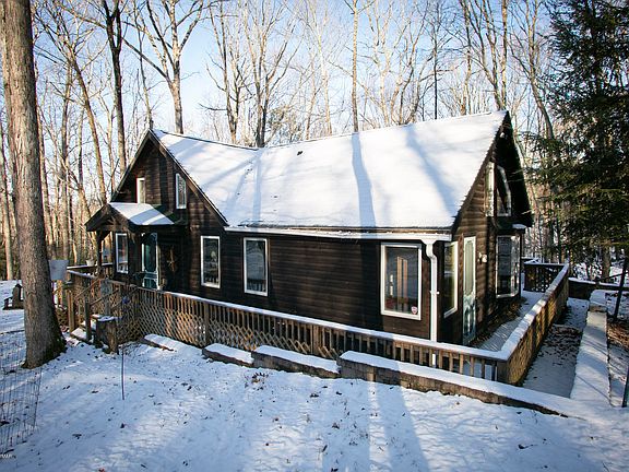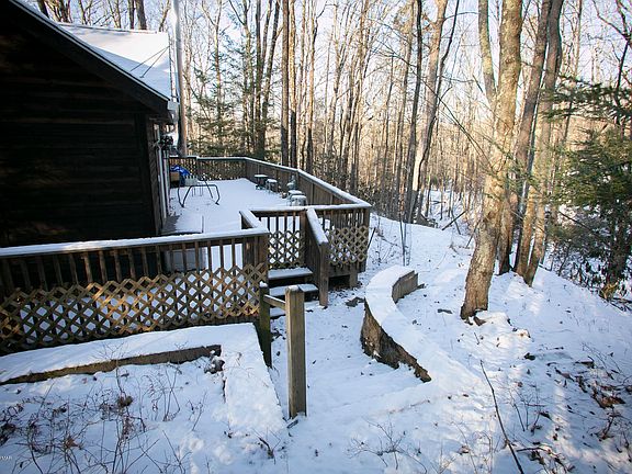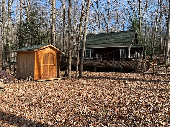 Cute and cozy cabin in the woods, overlooking a babbling brook with a stairway down to see the water. One large bedroom, full bath, with a spiral staircase to the loft for guests, spare bed or sitting room. New bedroom 16x24 addition put on in 2006. Large, 10 x 32, deck over looks a stream in the forest. Cozy with privacy. Minutes to state forest, yet not far from shopping and dining. The cozy woodstove in the living room provides the main source of heating. Low Taxes.