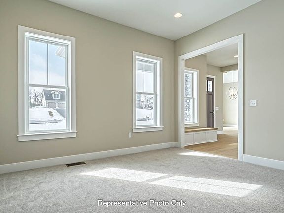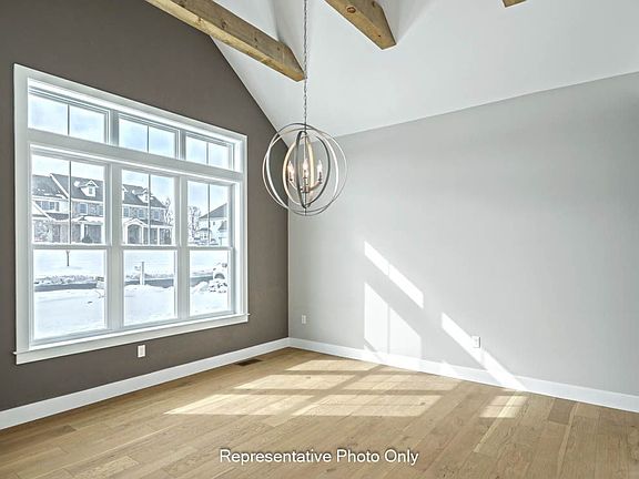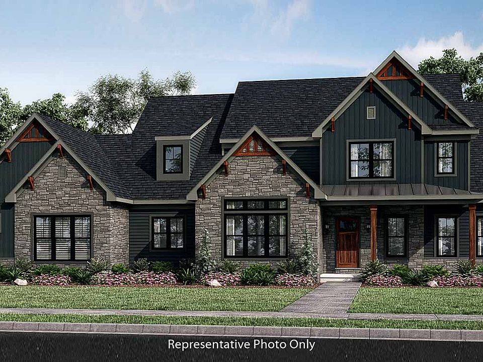 UNDER CONSTRUCTION: Designer details abound in this stately 2-story home with craftsman style exterior complete with fiber cement siding, attractive stone veneer, a welcoming front porch, and a walkout basement. A 3-car garage leads to the entry with built-in lockers and bench. To the front of the home is the study and elegant dining room with cathedral ceiling and stained collar tie beams. A convenient serving cabinet is situated between the dining room and the open kitchen with quartz countertops, tile backsplash, and stainless steel appliances. The sunny breakfast area provides access to the composite deck. The 2-story great room features a cozy gas fireplace with full height stone surround and box beam mantel. The well-appointed owner's suite with tray ceiling boasts a private bathroom with two quartz countertop vanities, a custom tile shower, and an expansive closet. On the 2nd floor are 3 additional bedrooms, 2 full bathrooms, spacious closets and loft space. Questions? Please contact the community sales manager.
