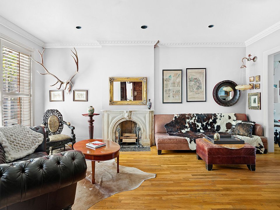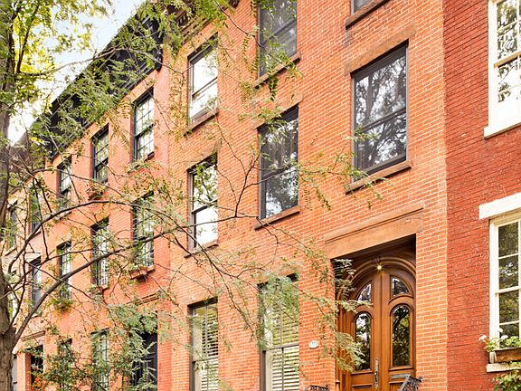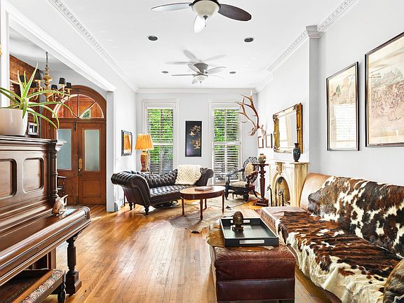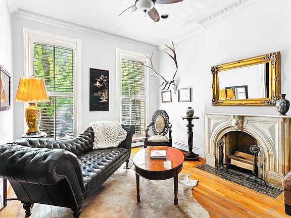 Well-proportioned and roomy, this graceful four story, two family Italianate-style townhouse embodies the relaxed and trendy vibe of Boerum Hill. The gracious upper triplex, with four bedrooms and two and a half bathrooms, sits above a garden level one-bedroom apartment. The home retains five carrara marble mantles from when it was built in 1869 along with some original mahogany woodwork. With a nod to the environment, solar panels were installed last year when the roof was replaced, providing more energy than the house consumes. At the top of the high stoop, enter the owner's triplex through a set of beautiful arched mahogany doors into a stunning parlor with high ceilings, elegant full height windows and two antique mantels. The front parlor leads to the formal dining room, perfect for entertaining, with a custom built-in bar and open to the kitchen with a large center island. Step outside to the home's serene refuge, a broad wooden deck overlooking a landscaped garden. Before heading upstairs, check out the delightful powder room tucked behind the stairs to catch a glimpse of yourself in the infinity mirrors. A route to the cellar has been maintained for the owner providing additional storage space and access to the mechanicals. The second floor contains two oversized rooms, one has been opened up to create an inviting place to chat, watch movies or read a book. Illuminated by three south facing windows, masterfully crafted dark wood frames the room and exposed brick adds warmth and texture. Cozy yet spacious, this surely would be your go-to spot to relax. The primary bedroom faces the garden with a walk-in cedar closet and an en-suite bath that contains a glass enclosed shower, fully renovated in 2014. A laundry room with full-size units and a separate closet in the hallway provide ample storage. The top floor offers two spacious bedrooms separated by another huge walk-in cedar closet. They share a luxurious windowed bathroom that showcases a gorgeous clawfoot tub along with double sinks and make-up stations with custom built-in vanities. This wonderful and well cared for home sits on a tree-lined block. Located close to Smith and Court Streets, there are many local shops and restaurants to enjoy. Three subway stations are easily within reach providing access to practically every corner of the city. Boerum Hill's history can be traced back to 1645 where your future awaits. *Some of the walls have been virtually painted.