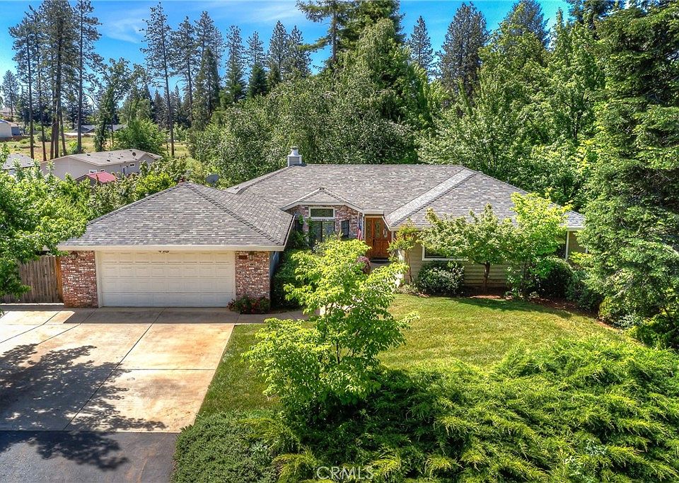 Welcome to your classic Paradise retreat—nestled among mature dogwoods and a towering fir, this charming home sits on a wide, quiet street that embodies everything folks love about life on the Ridge. Just minutes from Paradise Lake and surrounded by countless outdoor opportunities, this home offers the perfect blend of mountain living and suburban comfort. The brick-accented front entry welcomes you with timeless curb appeal, and the setting alone will have you feeling at home before you even step inside. Once through the door, you’re greeted by vaulted ceilings adorned with rough-sawn timber beams and a cozy wood-burning stove—ideal for crisp mountain evenings. Large windows in the living room frame views of the beautifully landscaped backyard, adding to the home’s warm and inviting atmosphere. The front formal dining room features tall ceilings and a charming stained glass window detail, letting in soft, filtered light. The galley kitchen is both functional and beautiful, with ample counter space, granite countertops, cherry wood cabinetry, and a cheerful breakfast nook overlooking your garden—perfect for slow mornings with a cup of coffee. Two guest rooms sit at the front of the home, while the wide hallway leads you back to the hall bath and the private primary suite. Here, you’ll find a peaceful retreat complete with backyard access and a small hot tub waiting for you on the rear deck. Outside, the setting is just as impressive. A concrete pad beside the garage offers space for additional storage or parking, while the raised garden beds, shed, and carefully tended landscaping invite you to enjoy the outdoors right at home. If you’ve been looking for that quintessential Paradise feel—a home with soul, shade, and space to live well—this is it.