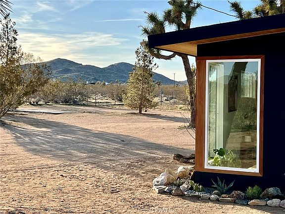 Shush! Super secret location! This handsome, freshly renovated home is located in a hidden valley on the extreme east edge of Yucca Mesa, just two lots away from the border to Joshua Tree (by zip code). This special valley is surrounded on all four sides by hills and small mountains with few homes and lots of privacy and quiet. The sellers have left no surface untouched in this very thorough, stylish remodel. Many of their improvements incorporate handmade touches like the cabinet pulls and exterior window frames. The sealed concrete floors have a gorgeous one-of-a-kind marbling effect. The bedroom can be closed off by the two handmade barn doors or thrown open to bring natural light in from all parts of the home. The kitchen features an vintage sea foam green range in incredible condition and is balanced out by the retro-look refrigerator in the same shade. Teak counters and breakfast table add lots of warmth to the decor and the whole-wall tile backsplash adds the fun. The full bathroom has been remodeled and includes a handmade custom sink stand design that echoes the finished ends of the wood decks in front of the house and off of the bedroom. The 5 acre lot is partially fenced so your pets can roam. The property features many large, mature Joshua trees. There are no neighboring homes in any of the directly adjacent lots. Homes in this secret jewel of a valley rarely come up for sale. Now is your chance! NOTE CORRECTION: The county shows it as Joshua Tree.
