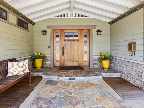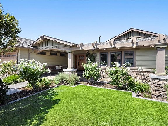 Nestled at the end of a peaceful cul-de-sac, this fully remodeled single-level home provides a seamless fusion of classic craftsmanship architecture with contemporary design elements. On approach, you will be immediately captivated by this home with its beautifully landscaped front yard and expansive custom covered outdoor entry with slate pavers and craftsman wood door. Inside, the attention to detail with the flawless custom millwork framing, cabinetry, custom arches, crown moldings, wainscoting, architectural door and window casements and lighting elements will evoke an ambiance rarely found today. The spacious living room is centered around a slate fireplace and gorgeous built-ins, providing a classic charm. The chef's kitchen is a culinary delight, featuring stainless steel appliances, granite tile countertops, a large center island, custom cabinetry and adjacent dining room. Whether you're relaxing at home or hosting friends and family the sunroom (435 SF not included in the home SF) provides a tranquil retreat bathed in sunlight overlooking the lush backyard and offers a seamless connection to the outdoors. The reimagined primary suite features a luxurious en-suite bathroom with dual stone adorned vanities, an immense walk-in shower and walk-in closet. Two additional well-appointed bedrooms and a fully remodeled bathroom plus an office make this a tremendously versatile floorplan. Whether you're basking in the sun, enjoying dining alfresco, taking a refreshing dip, unwinding in the spa, or enjoying the fireplace on chilly evenings, this outdoor haven is a sanctuary of tranquility and fun. An RV accessible lot allows your toys to be ready for adventure or create a sports court or additional grassy area. Location is in close proximity to freeway access, shopping, and highly sought-after Villa Park schools. With its Craftsman-style charm, expansive lot, and cul-de-sac location, this property embodies the perfect blend of privacy and convenience.