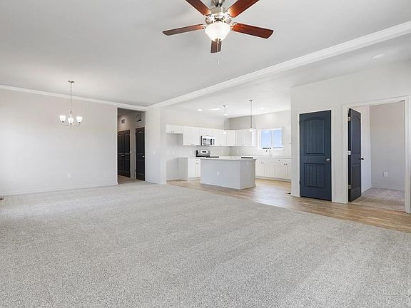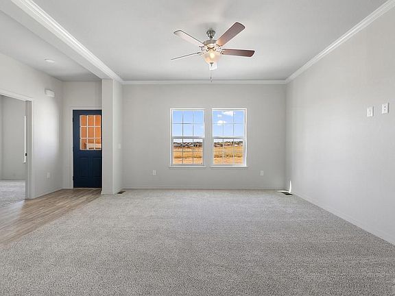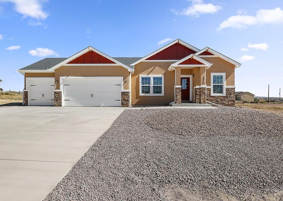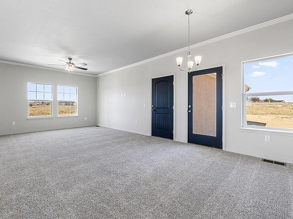 Simply sophisticated! As you enter the home, you will find a large Living room with carpeted floors that is open to the Dining area and Kitchen. The Dining area has a walk-out to the back patio. The Kitchen has a large center island, stainless steel appliances (minus a refrigerator), stunning cabinets, quartz counter tops, and a large pantry. Off of the entry is a private office or flex space. The Master Suite is very spacious with French doors, adjoins to a 4 pc Master Bath with an oversized walk-in shower, double vanity, and a walk-in closet. There are 2 other bedrooms, a full bathroom, and laundry area that leads into the garage. The cool color scheme features navy blue doors and white cabinets. Everything is on the main level with no stairs! The 3 car attached has 2 openers. Front yard will be xeriscaped. Located in beautiful Pueblo West on Acreage Lot located by Lake Pueblo and Close to Hiking and Biking Trails.