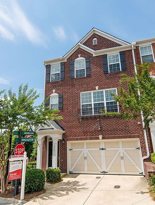 This spacious end-unit townhome is on a prime lot in the subdivision, bordering green space and steps from the clubhouse & pool! With 4 BR & 3 finished levels there is plenty of room to spread out. You'll love this HUGE kitchen & open floor plan with tons of natural light! Home boasts fresh paint throughout, new flooring, SS appliances, custom master closet system, fenced yard, & storage everywhere you look. Relax in sunroom or on one of 2 decks, all with private wooded view. Only 8 miles from SunTrust Park, 20 min to downtown, & minutes to shopping, restaurants & more!
