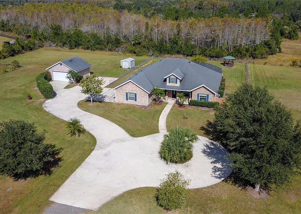 Book your tour of this exclusive 3 bed 2 bath with Pool and total of 5 car garage on 10 acres. Escape to tranquility with this stunning, spacious residence, nestled in the serene embrace of nature and conveniently positioned between the vibrant energy of Orlando and the tranquil allure of the nearby beaches. Nestled on a sprawling 10-acre expanse of meticulously landscaped grounds, this home presents a welcoming ambiance that is sure to captivate. Step inside to discover a meticulously designed interior featuring a formal dining room, complemented by an inviting eat-in kitchen adorned with stainless steel Whirlpool appliances, dazzling granite countertops, 42-inch maple cabinets, and a convenient breakfast bar, ideal for casual meals and gatherings. The bonus room, enhanced by two elegant glass-front French doors, is perfectly suited for an office, a den, or a private library, providing a versatile space to suit your lifestyle. Revel in the luxurious Brazilian cherry wood floors and the timeless elegance of porcelain tile that graces every corner of this immaculate abode. Appreciate the comfort offered by ceiling fans in every room and the lanai, while 9'4" ceilings, cathedral doors, and polished nickel lever handles add an air of sophistication to every detail. The expansive master suite beckons with its generous proportions and a custom-designed En-suite bath that features a natural river-stone shower and exquisite slate accents throughout. Enjoy the luxury of not one, but two sprawling walk-in closets, offering ample storage space and convenience. Outside, a grand circular driveway leads to the side-entry 3-car garage, providing an elegant entrance to your new abode. A 12-by-10-foot shed offers additional storage, while a vast covered lanai and a generously fenced yard create an inviting outdoor haven, perfect for hosting gatherings or simply basking in the tranquility of your surroundings. Embrace a lifestyle of peace and serenity in this remarkable home, where every detail has been meticulously curated for the utmost comfort and enjoyment. With seamless access to I-95, SR 415, and just minutes away from 417, this home offers the perfect blend of seclusion and connectivity. Water softener for well installed.