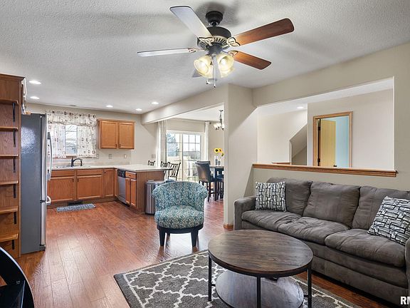 Welcome home to this charming 3 bedroom, 2.5 bathroom gem featuring an attached 2 car garage, a new roof in (2021) and a new sump pump with battery back up in 2023, enduring peace of mind. Step inside to discover an open floor plan that seemlessly connects the kitchen, dining area, and living room-Perfect for entertaining or cozy evenings at home. Sliding doors off the dining room lead to a brand new composite deck and a paved patio, ideal for outdoor gatherings. The interior showcases all-new flooring, with durable luxury vinyl on the main floor and bar area, plush carpet in the bedrooms, and sleek tile in the full baths. Convenience meets style with main-floor laundry and a spacious main bedroom that features vaulted ceilings, a full ensuite bath, and large walk-in closet. Step into this beautifully finished rec room, designed with cozy fireplace and bar area, complete with wine fridge. An egress window brings in natural light, and there is a rough-in ready for an additional bathroom and 4th bedroom. A utility sink adds convenience to this versatile space. Ideally located near Davenport Eastern Library, the Veterans Memorial Parkway Trail, and plenty of shopping, this home offers easy access to both leisure and everyday necessities. Audio and Video active. Come make this home yours today!