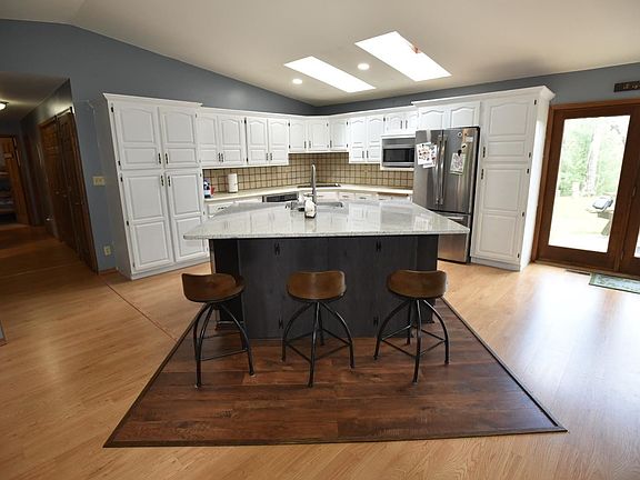This Legend Lake property sits SO close to the main lakes and SO close to the solitude of a non-motorized area filled with nature. With protected land across from you, there will never be anyone building or living there which gives you added peace and peace of mind for kids swimming at your sandy beach in a VERY wide part of the channel. The giant wrap around deck gives you sun at any time of the day. Stoned fire pit area lets you look out over the water. 100' of water frontage gives you room to have a couple boats/lifts and still have an amazing swim area. Kayak in the morning with steam off the lake and the sounds of the loons around you. The nature here is abundant. Main level laundry.