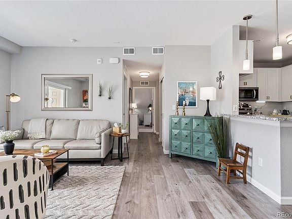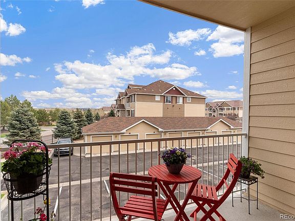 Don't miss this like-new condo that showcases beautiful finishes and stunning mountain views! The delightful interior is warm and welcoming thanks to its open floor plan, gorgeous hardwood floors, granite countertops, neutral paint, tall ceilings, and ample natural light. Take in the mountain views from the private covered patio while enjoying your morning coffee or an after work cocktail. The modern kitchen boasts a breakfast bar, abundant cabinetry, stylish gold hardware, a pantry, a tile backsplash, and stainless steel appliances. Retreat to the primary suite that impresses with a large bedroom, a walk-in closet with an organization system, and a private bathroom complete with double sinks and a tiled walk-in shower. The floorplan is completed by a full bathroom, a sunny secondary bedroom, and a laundry closet with an included washer and dryer. As an added bonus, the unit comes with a secure reserved parking space. Savannah Condos is a quiet, gated community that offers lush grounds, a clubhouse, fitness center, playground, and a pool and hot tub. Fantastic location within the Cherry Creek School District blocks away from Cherry Creak Valley Ecological Park, miles of trails, shopping, and restaurants.