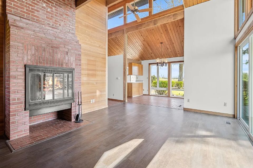Brick wood-burning fireplaceVaulted cedar ceilingFloor-to-ceiling windows